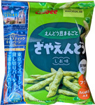 素材だけでなく、形がさやえんどうなスナックです。さやえんどうの旬は春だと思います(個人の感想です)。ノンフライではありますが、少量の油を吹き付けているそうです。フライでもいいと思いますが、食物繊維とかたんぱく質とか、いろいろ気になる人、私を含め、にはうれしいスナックです。293kcal。